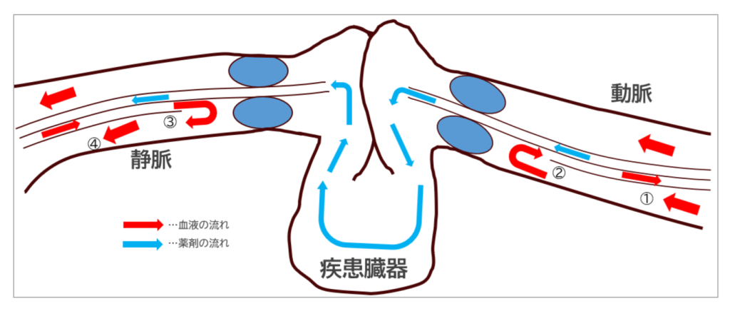 *1ドラッグデリバリーシステム:医薬品の有効成分を治療対象となる標的(主として臓器)に届けるためのシステムです。通常は医薬品に標的臓器に選択的に到達するような分子を化学的に付加したり、薬物を脂質の二重膜で包んだりする手法が使われます。しかし当社では、物理的に動脈側カテーテルで対象臓器にアプローチし、さらに静脈からもカテーテルでアプローチすることにより、物理的に医薬品を届けることをもってドラッグデリバリーシステムの一つとしています。